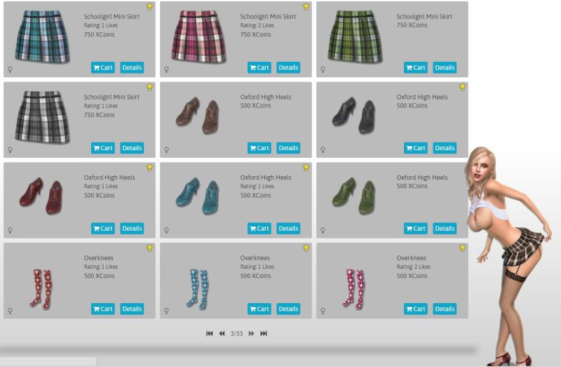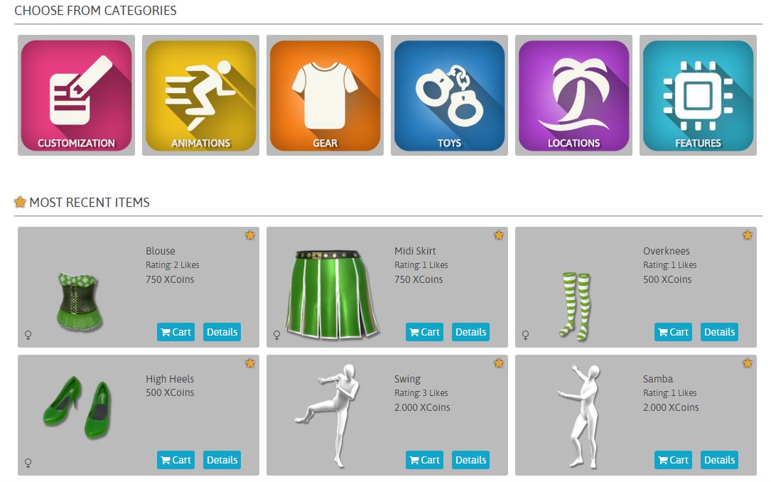 Now back to the Chathouse 3D Clothing, once Chathouse 3D is running you can click on the buy upgrades option which will take you to the shop, click on the “Gear” category and browse and buy whatever you want. You can buy all manner of things in the store, not just clothes, from body customizations such as skin colour, tattoos, nail colours, hair, genital hair and body part enhancements etc. through to Locations and extras. There are six categories to choose from, these are Customizations, Animations, Gear, Toys, Locations and Things. There is currently only one additional location but a huge number of different Chathouse 3D clothing options.