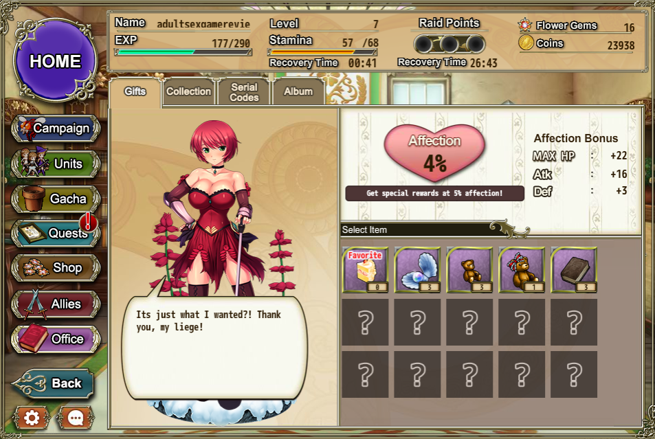 You lead them through the fight collecting gifts and coins and special powers along the way and helping them to defeat the pugnacious pests and the raid bosses. Shower your favourite Flower Knight Girl (or girls) with gifts that you gain along the way and when you get them to 100% they will throw themselves at you to do with as you will, these are the x-rated scenes that you will want to see again.