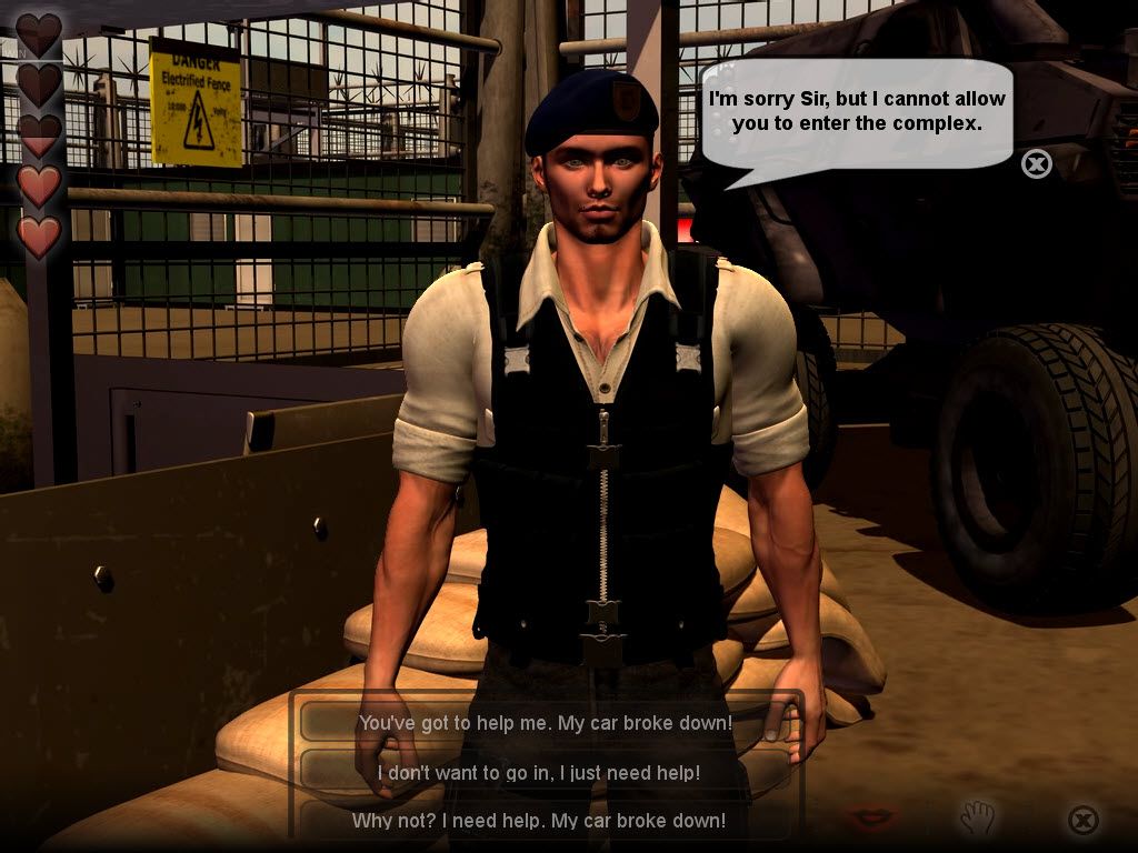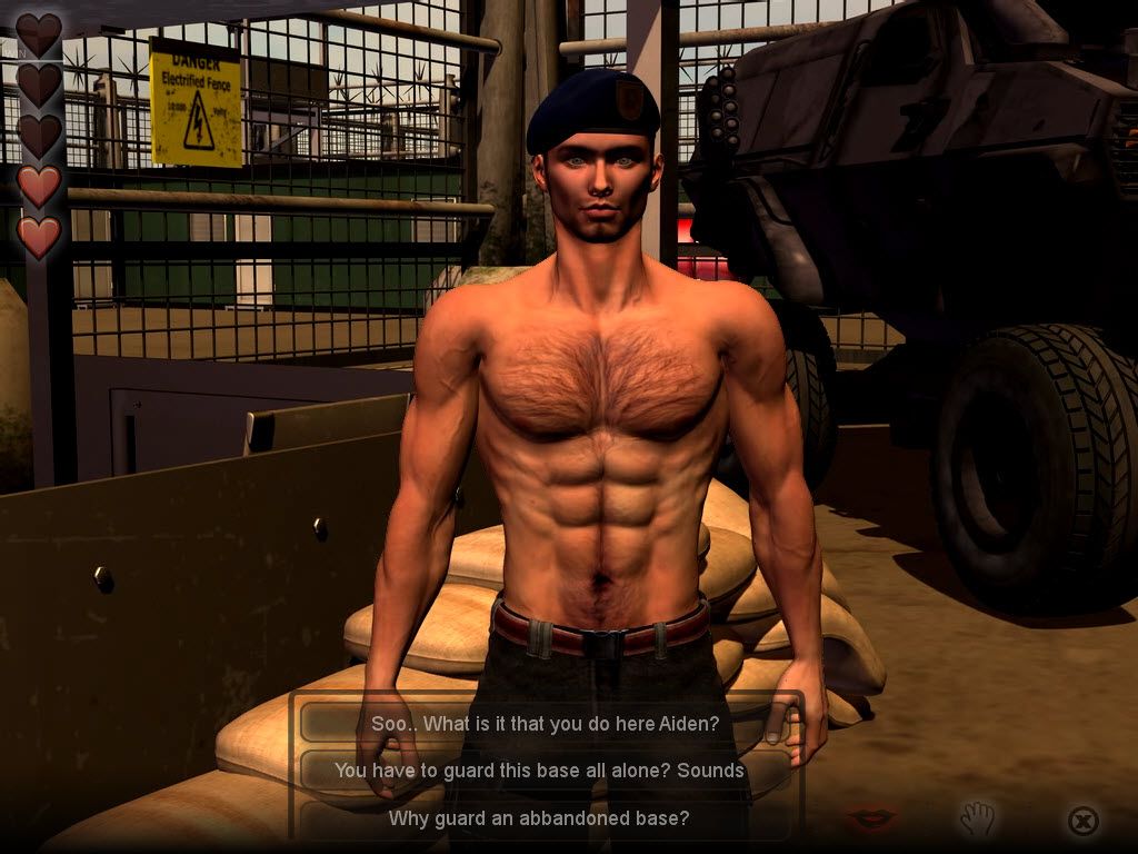 The basic storyline requires that you convince the military guard Aiden to help you get out of a problem because you have broken down in the ass end of nowhere. Will you be able to get him to help, and why is he there alone?